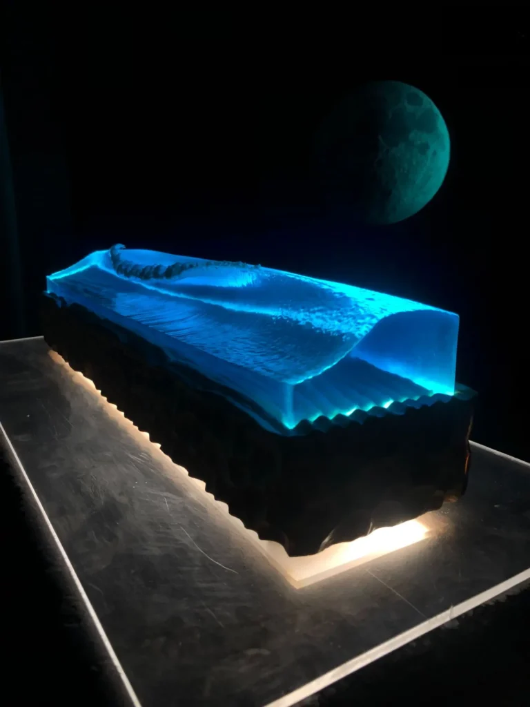 Tratando de copiar las impresionantes montañas de agua capturándolas como una fotografía en 3D, sacando un píxel cúbico en el lado mas crítico de ella, para mostrar todas las caras de las olas del mar con sus diversos matices de colores y sus diferentes fondos marinos, esculpiéndolos con materiales de resina para darle un total acabado realista con sus diferentes texturas y transparencias.